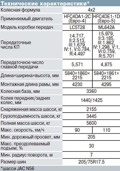 Конструктивно «эн-пятьдесят шестой» мало отличается от 5,2-тонного Isuzu Elf модели NMR85H. И даже в чем-то превосходит официально поставляемую в Россию версию прототипа. Например, передние тормоза у «китайца» дисковые против барабанных у «японца». В отличие от современного 3,0-литрового двигателя модели 4JJ1, что ставят на Isuzu, на JAC N56 идет модернизированный 2,8-литровый дизель поколения 1980-х годов. По китайской номенклатуре он обозначается HFC4DA1-1, а фактически это широко распространеный в мире мотор 4JB1, впервые появившийся на легковых внедорожниках Isuzu семейства Trooper/Bighorn, а затем – на их аналогах марки Opel. Усиленные версии этого мотора – с шестеренным приводом ГРМ вместо зубчатого ремня и чугунной головкой блока цилиндров – ставили на малотоннажники семейства Elf, разнообразную спецтехнику, выпускавшуюся во многих странах мира, а также маломерные суда. Сама фирма Isuzu уже давно не собирает этот двигатель, но в Китае налажено его массовое производство. Именно мотор 4JB1, выпускаемый китайской фирмой F-Diesel, ставили у нас на автомобили УАЗ по индивидуальным заказам. На JAC N56 агрегат 4JB1 идет, разумеется, уже не с механическим впрыском топлива, а с аппаратурой Common Rail от фирмы Bosch и отвечает требованиям норм Евро-4. Мощность двигателя-ветерана по меркам современных среднетоннажников невелика – всего 116 л. с., и импортер предлагает альтернативу: более современный 150-сильный мотор HFC4DE1-1D класса Евро-5 почти такого же рабочего объема. Но последний, в отличие от «еврочетвертого» HFC4DA1-1, оборудован системой впрыска раствора мочевины, поэтому покупателей, желающих обрести лишние проблемы, практически нет.