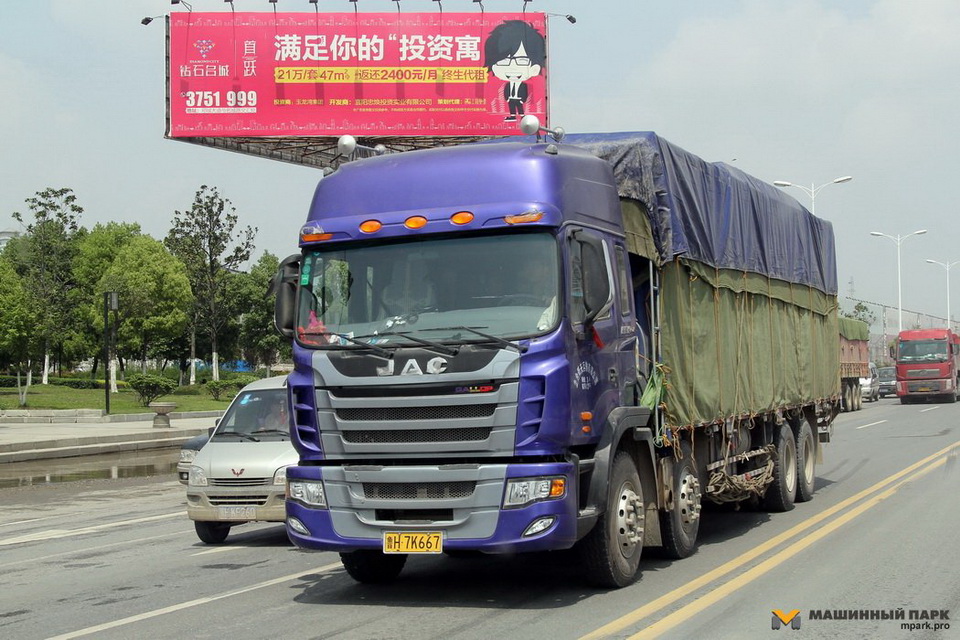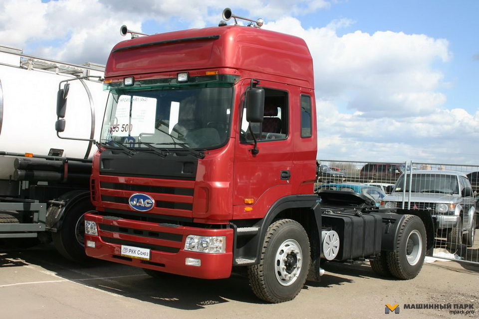 11. Этот седельник относился к семейству Gallop. В отличие от младших классов, у "Галопов" нет собственных дизелей, а только «общекитайские» Weichai WD615. Стилизованная под Сканию кабина этой серии у других китайских грузовиков не встречается. Выглядит как Scania, но по происхождению она – корейская, разработана концерном Hyundai, с которым JAC образовал СП в 2001 году.
