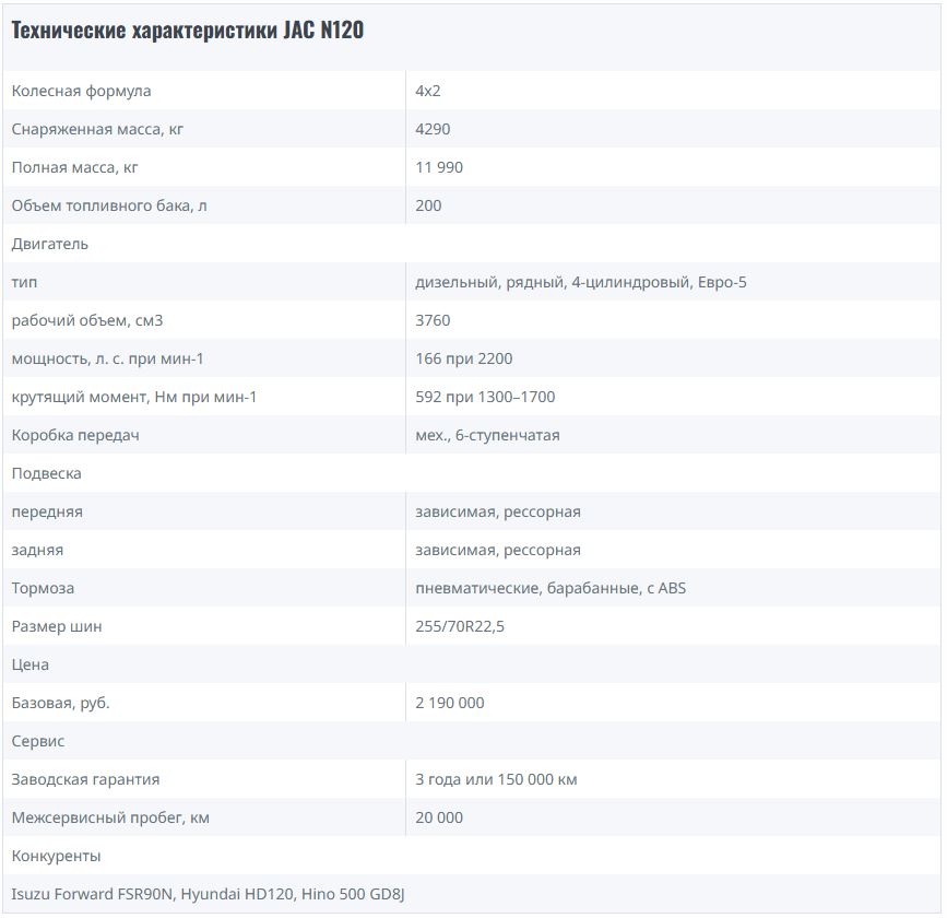 JAC N120. Полная масса: 11 990 кг. Начало продаж: 2016 г. Цена JAC N120: от 2 190 000 руб.