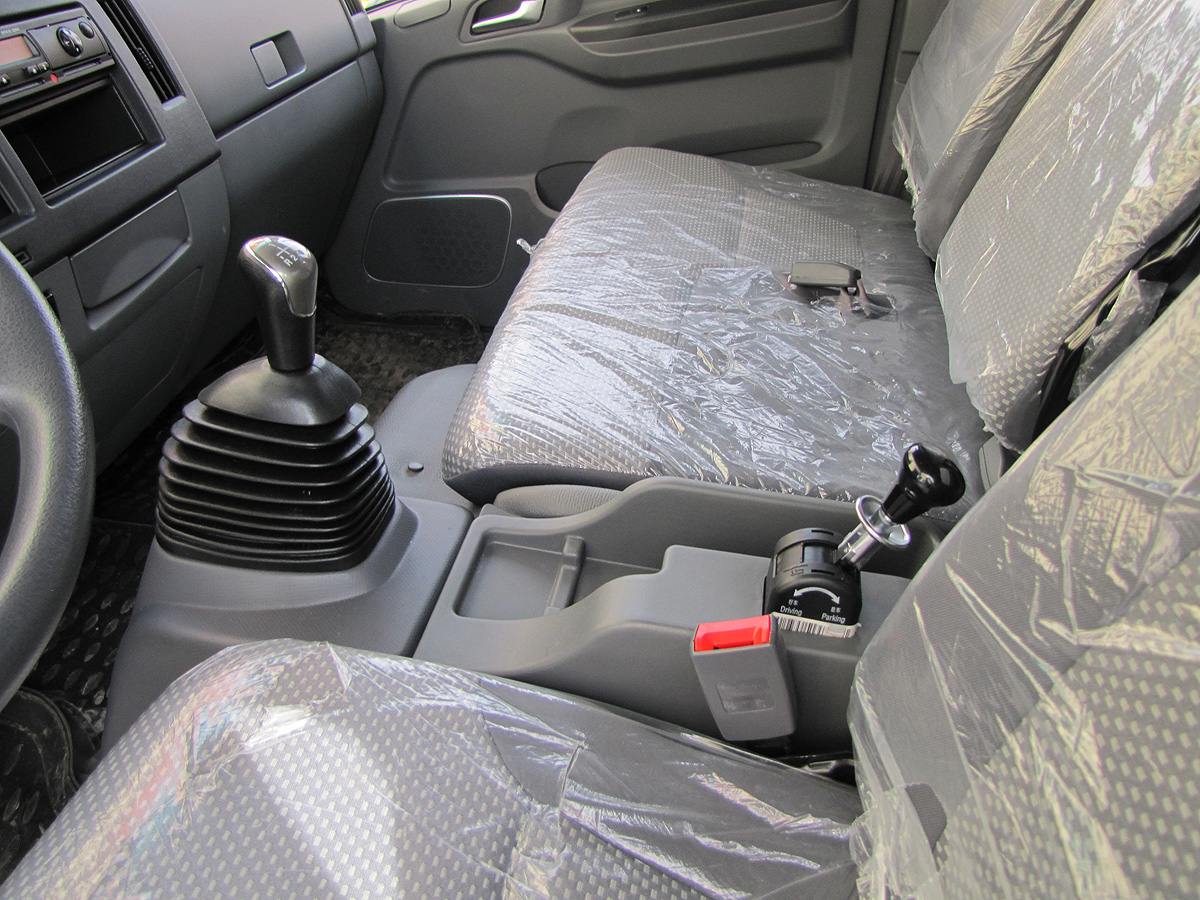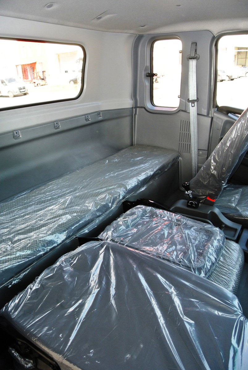 Благодаря удобным противоскользящим ступенькам и ручкам на передних стойках посадка в трехместную кабину JAC N120 не вызывает затруднений. Подстроиться под органы управления водителю позволяют перемещаемый по углу наклона и вылету руль, а также сиденье водителя, регулируемое в продольном направлении и по углу наклона спинки. Зато минусом является отсутствие подвески. Сиденье среднего пассажира узкое, с низкой спинкой и без подголовника. Находиться на нем во время поездки не очень комфортно. Сзади есть спальное место размером 1740х400 мм — маловато, конечно, но если откинуть вперед спинки пассажирских сидений, получим дополнительное пространство для отдыха. Благодаря большой площади остекления и наружным зеркалам заднего вида обзор с места водителя заслуживает одобрения. Задние боковые окошки с поворотными стеклами улучшают вентиляцию.