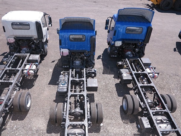 В основе грузовика «JAC N56» – клёпанная усиленная рама 170 мм х 60 мм с толщиной 5 мм, лонжеронного вида – «лесенка», на которой размещаются все основные узлы и агрегаты. «По кругу» грузовик характеризуется зависимыми подвесками на продольных полуэллиптических рессорах с гидравлическими амортизаторами и стабилизаторами поперечной устойчивости.