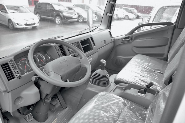 Спальное место и вообще возможность ночевать в кабине отсутствует – это минус. В дальние рейсы на «JAC N75» не поездишь, грузовик «заточен» под работу в течение дневной смены. Светло-серая обивка в целом добавляет объёма салону кабины, но взамен этого требует периодической чистки.