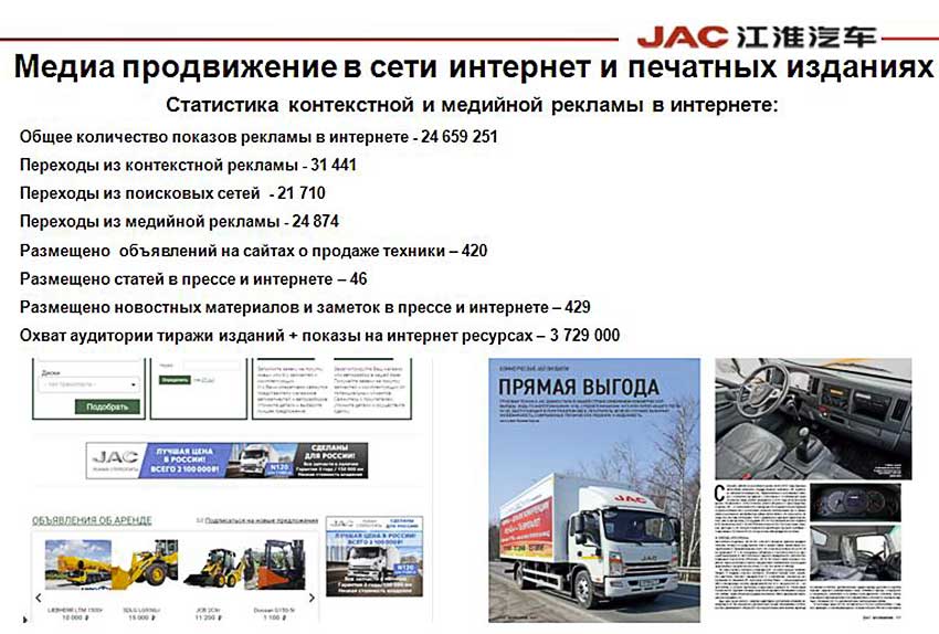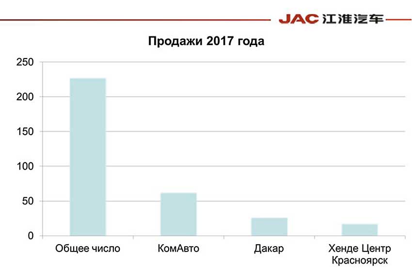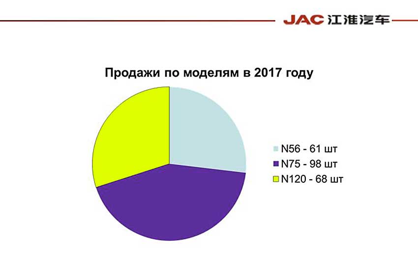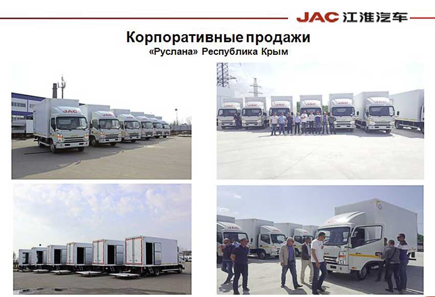 В 2017 году дилерам при слаженной работе с представительством удалось реализовать несколько корпоративных сделок. Так, 3 мая в городе Анапа состоялась торжественная передача семи грузовиков N75 коммерческому предприятию «Анклав». Кроме того, в Республике Крым фирме «Руслана» были переданы грузовики N75, а в Красноярске пять фургонов JAC N120.