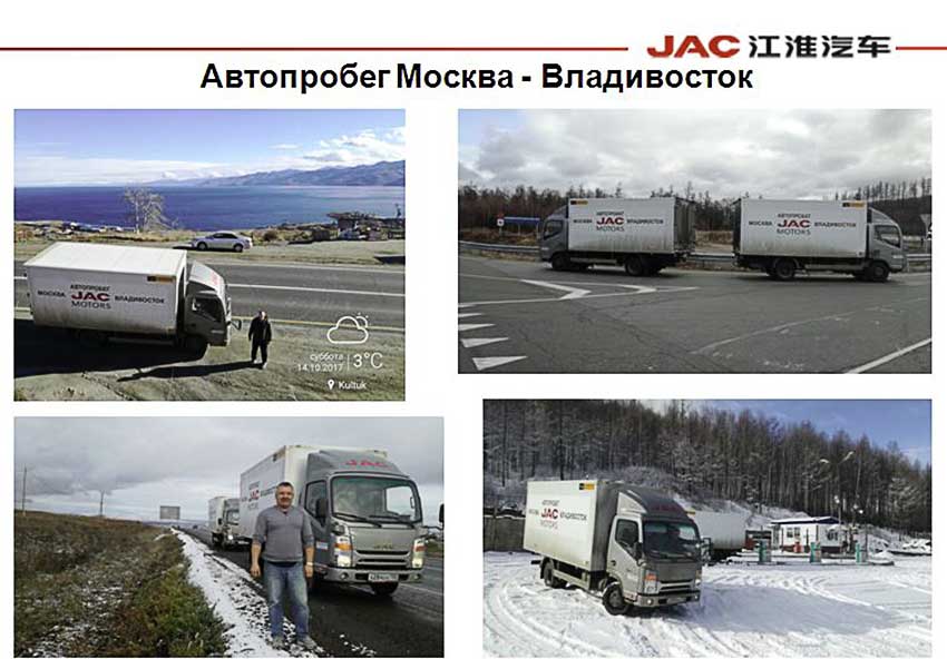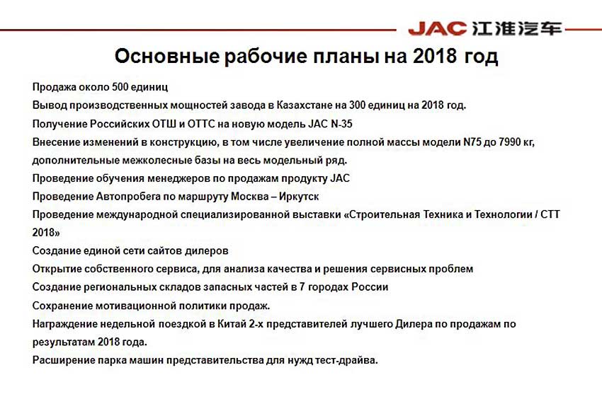 Компания постоянно самосовершенствуется. Идет разработка новых конструкций, адаптация под пожелания конкретных потребителей и экспортных рынков. При выявлении конструктивного недостатка в конструкцию оперативно вносится соответствующее изменение. Россия всегда была для Китая стратегически важным партнером, именно по этому для генерального дистрибьютора JAC Motors в России – «Джак мобиль» оказывается полное содействие и поддержка для максимально успешного развития бизнеса.