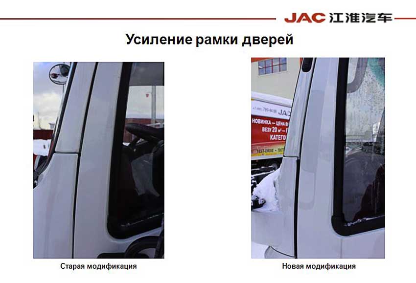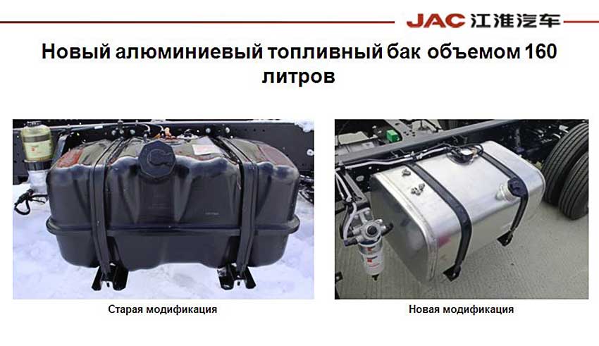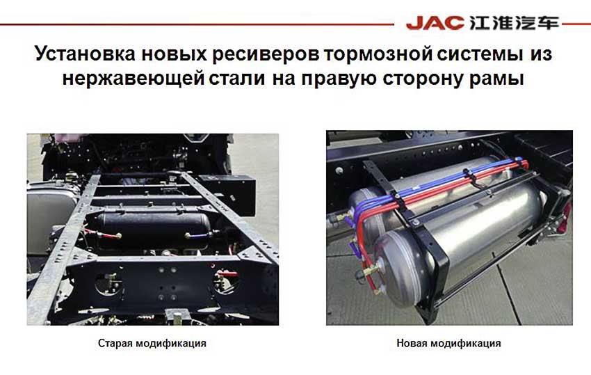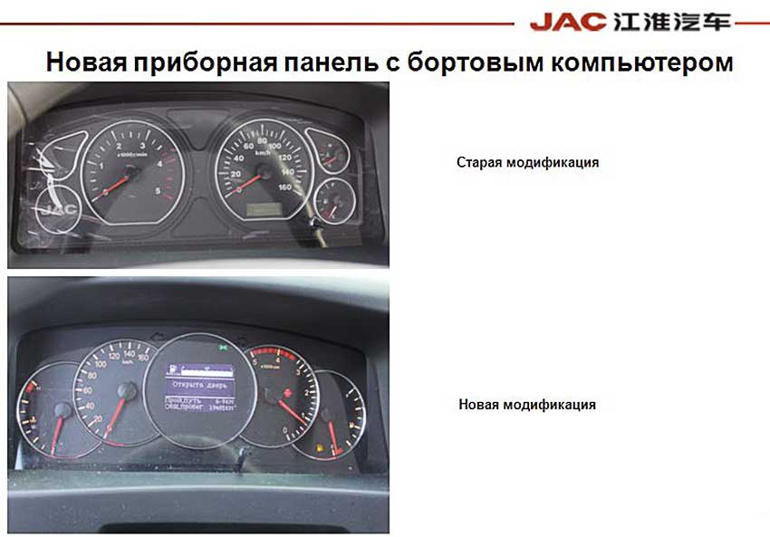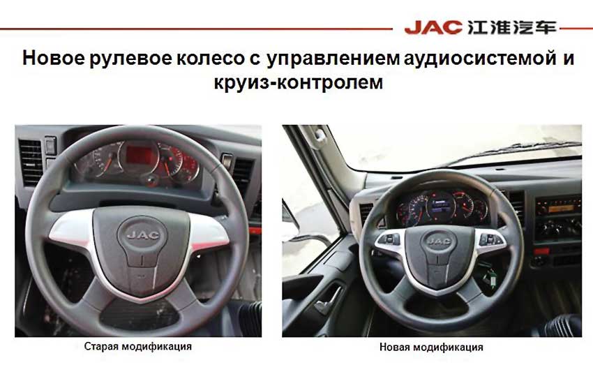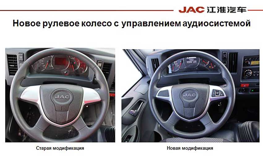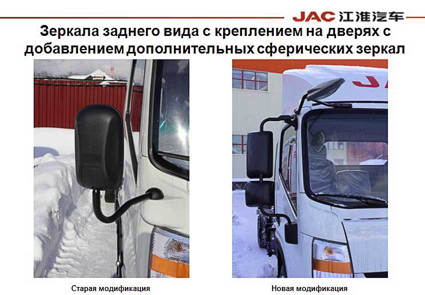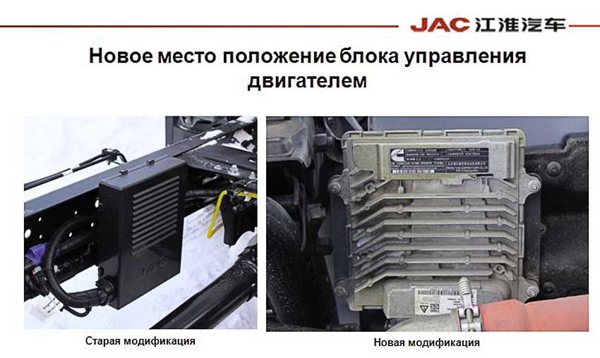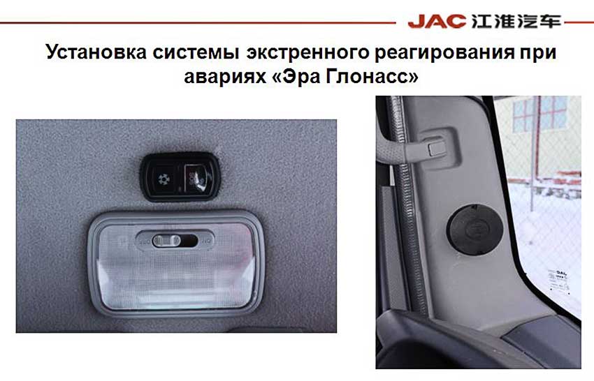 Согласно Российским законам с 1 января 2018 года все ТС импортируемые на территорию нашей страны должны быть оснащены системой ЭРА-ГЛОНАСС, реагирующей на аварию и переворачивание. Соответственно в течение 2017 года был проведен большой объем работ для получения разрешительной документации, разработан схема установки на наши автомобили, проведены испытания и другие виды работ по внесению изменений в конструкцию шасси и документацию соответствующих изменений в связи с установкой данной системы. С января этого года абсолютно все автомобили с двигателями Евро-5 импортируются с установкой данной системы. При этом JAC приняла решение сохранить уровень цен на машины Евро-5 неизменным, несмотря на установку данной системы.