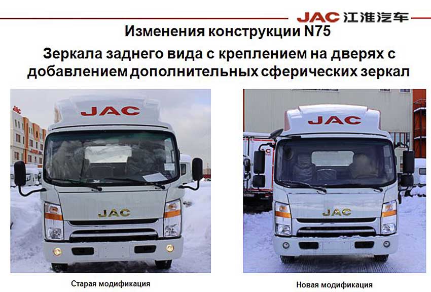 Изменена конструкция и количество зеркал заднего вида на моделях N56 и N75, которые получили по четыре зеркала, включая полусферические, кроме того на вынесенных на большее расстояние штангах, что позволяет применять более широкие надстройки и кузова в соответствии с российскими стандартами.