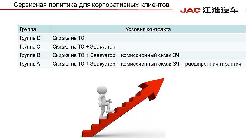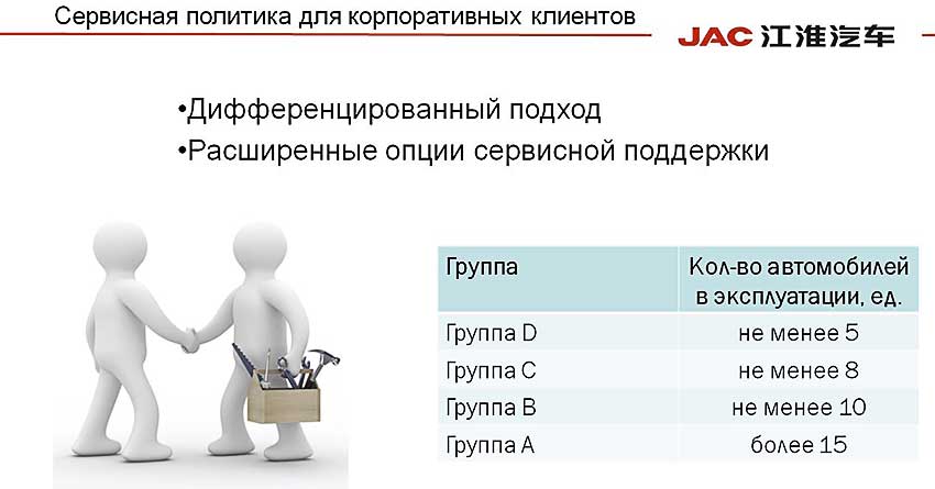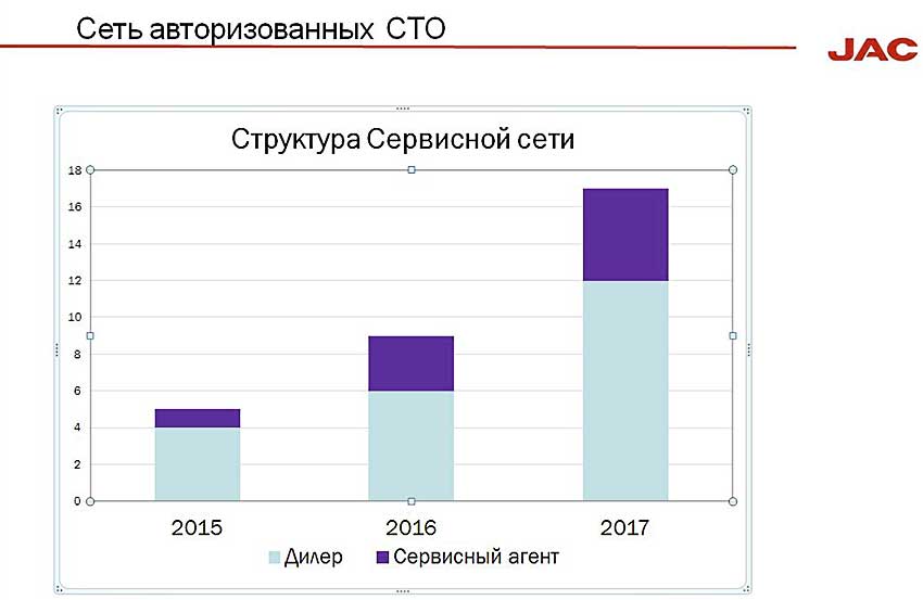 Развитие сети авторизованных СТО предполагает их следование стандартам идентификации JAC, обучение специалистов и инженеров по гарантии, наличие склада запасных частей.