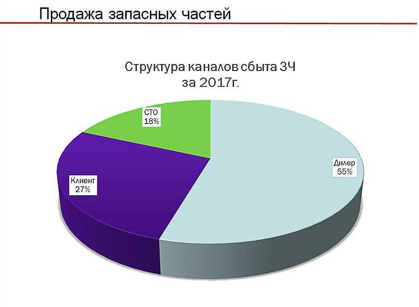 Структура сбыта запчастей, которых, кстати, в 2017 году было реализовано на ₽6,5 млн распределилась так: на долю дилеров пришлось 55%, по линии СТО было реализовано 18% запчастей, а остальная доля в 27% пришлась на покупки непосредственно клиентами. Создание в ближайшей перспективе магазина розничной торговли запчастями к автомобилям JAC должно дополнительно развязать руки клиентам и повысить степень их доверия к бренду JAC (хотя представители российского подразделения и поклялись не забывать о набирающей темпы интернет-торговле).