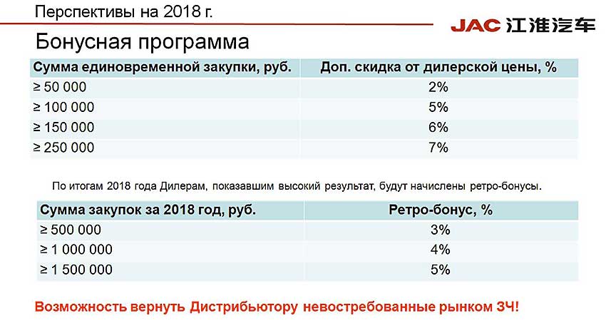Бонусная программа для дилеров предполагает возможность увеличения стоимости нормо-часа в 1,4 раза или до ₽1680. Разработана также целая сетка скидок в зависимости от величины единовременной закупки, а также внедрение т.н. «ретро-бонуса» для самых результативных дилеров. Кстати, невостребованные запчасти можно буцдет возвращать дистрибьютеру.