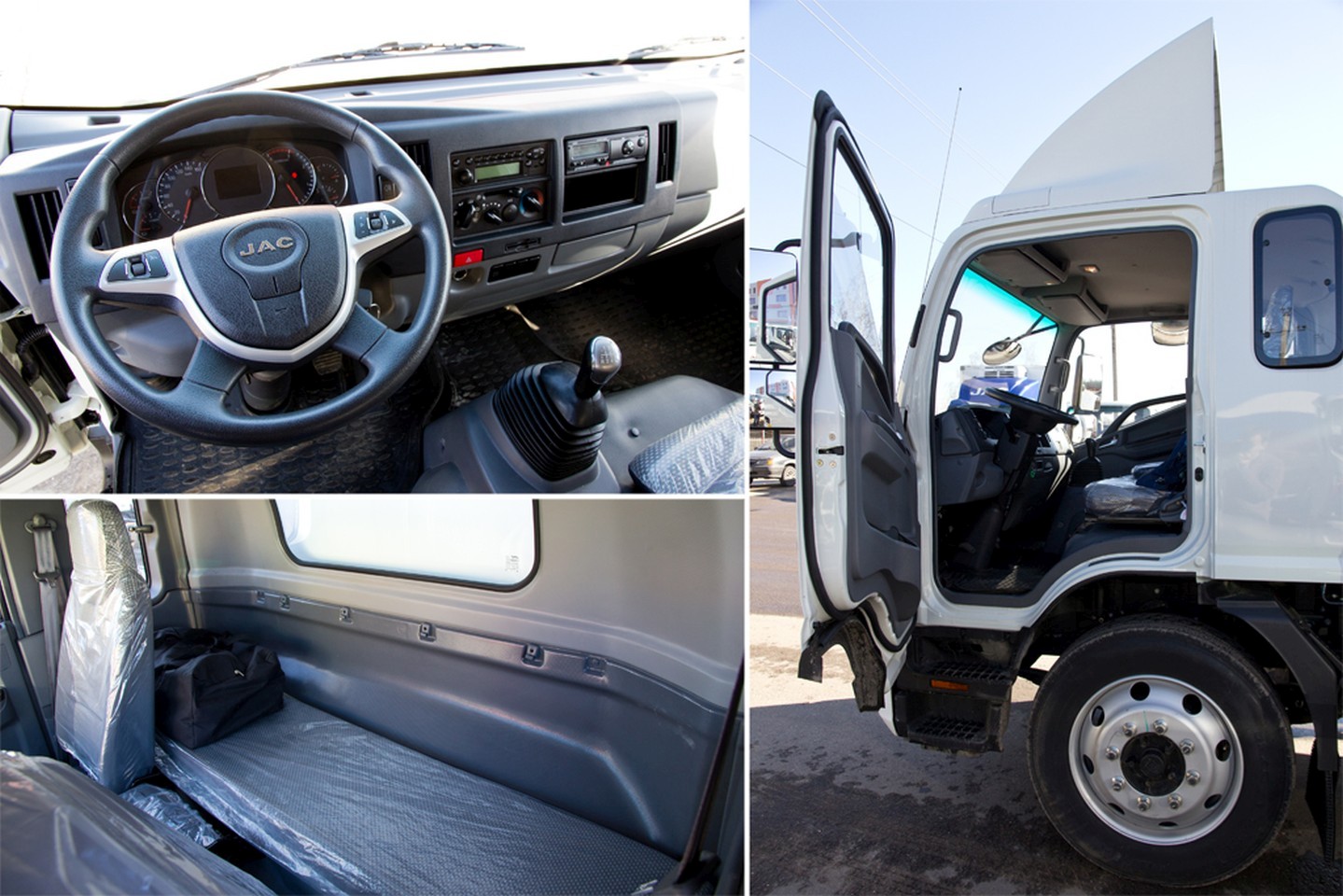 Продолжим наше знакомство с машиной в кабине. Доступ в неё лёгкий благодаря противоскользящим ступеням и ручкам на передних стойках. Сама кабина аналогична той, что установлена на модель N-75, за исключением наличия спального места у кабины N-120. Спальное место не поражает своими размерами, но для машины такого класса его достаточно. В целом интерьеры модели N-75 и N-120 практически идентичны, все органы управления на тех же местах. JAC N-120 получил новое мультифункциональное рулевое колесо, с помощью которого можно управлять магнитолой, а также круиз-контролем. В будущем такой руль получат и младшие модели. Кстати, круиз-контроль входит в стандартное оснащение грузовика, как и другой хороший помощник для водителя – горный тормоз. Из «комфортных» опций за отдельную плату предлагаются: кондиционер, центральный замок, электростеклоподъёмники.