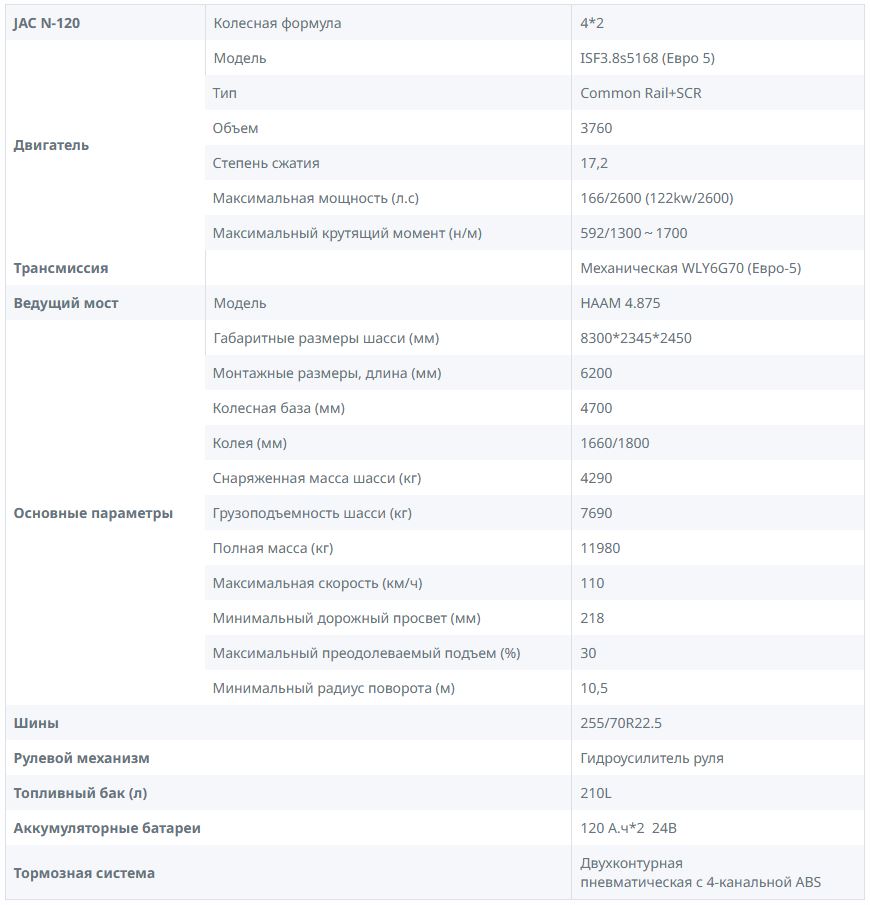 «Сердце» JAC N-120 – дизельный двигатель Cummins ISF3.8s5168, Euro-5, объемом 3,76 литра, мощностью 166 «лошадей» и крутящим моментом 592 «ньютонов» на метр.