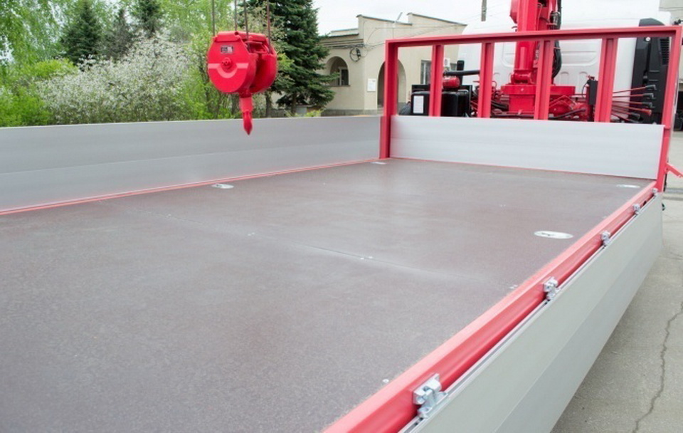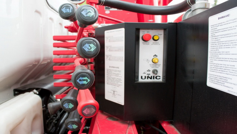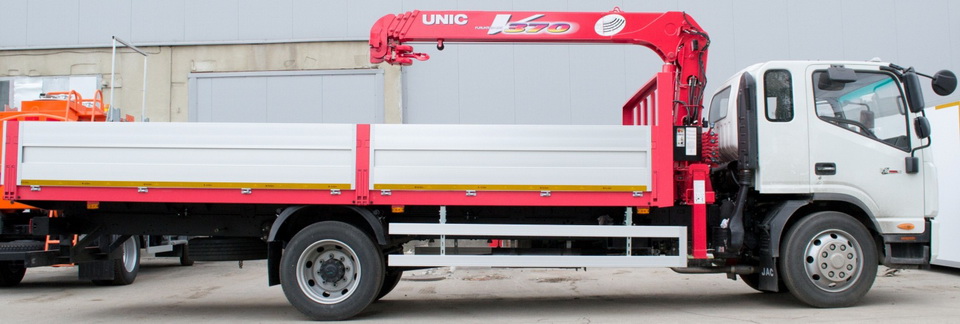 Кран-манипулятор с модернизированной установкой UNIC 374K (г/п 3 030кг.) и алюминиевой бортовой платформой (г/р 6200х2550х600мм.). Дополнительная комплектация доработки включает быстросъемные стойки на бортовой платформе, технологическое удлинение и усиление задней части рамы шасси, открытые профиля, шесть такелажных колец в платформе, монтаж КОМ с электро-пневматическим управлением. Так же, автомобиль укомплектован пластиковыми брызговиками, боковой защитой, противоподкатным брусом и светоотражающей маркировкой. Установленная система Юни-крюк, позволяет осуществлять автоматическое закрепление крюка в транспортное положение непосредственно под самой стрелой, что существенно облегчает операцию приведения КМУ в транспортное положение.
