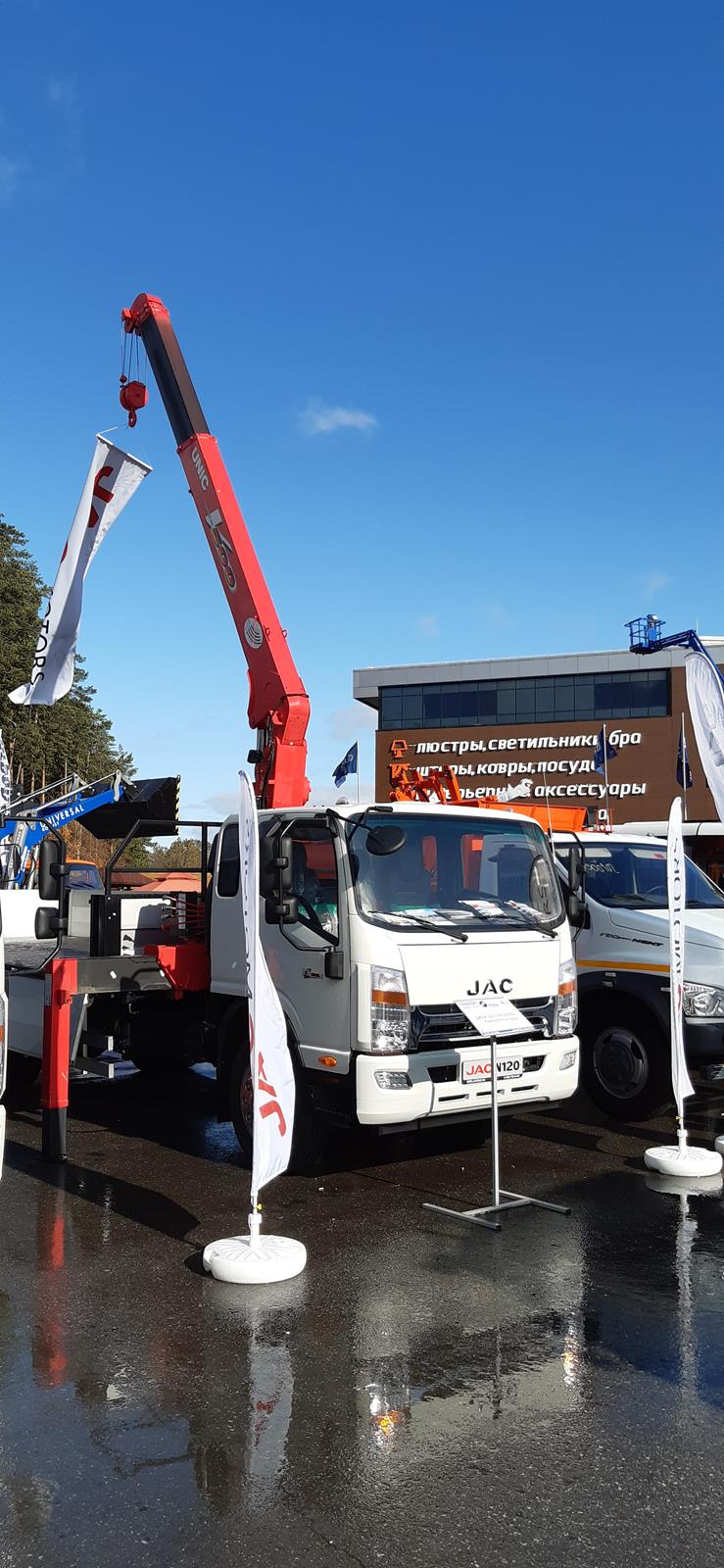 Также на выставке продемонстрировали другой популярный вариант использования шасси в исполнении с крано-манипуляторной установкой UNIC URV504 и бортовой алюминиевой платформой размерами 6200х2550х600 мм на базе стандартного JAC N120. Версия с КМУ вызвала большой интерес у местных перевозчиков, поскольку автомобиль идеально подходит для широкого спектра хозяйственных задач и работы с самыми разнообразными видами грузов.